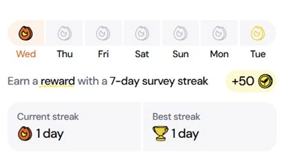 Another way to earn is through daily streaks. By completing at least one survey per day, you can earn bonus points. This feature encourages regular participation, and you don’t have to do anything extra—just complete a survey daily to earn streak rewards.