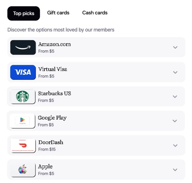 Points earned from surveys and daily streaks can be redeemed for rewards such as gift cards or prepaid Visa cards.