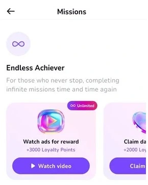 Cuze features daily and weekly missions that grant small amounts of Loyalty Points.