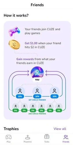 One of the main ways to earn in Cuze is through the “Playtime” section. Here, you’ll find a list of mobile games, each with a series of tasks, such as reaching specific levels or unlocking milestones.