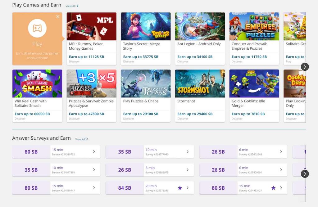 Surveys take anywhere from 3 to 20 minutes and usually pay between 20 and 100 SBs. You’ll also get 1 SB daily for completing the quick daily poll. It’s easy money for a few spare minutes.