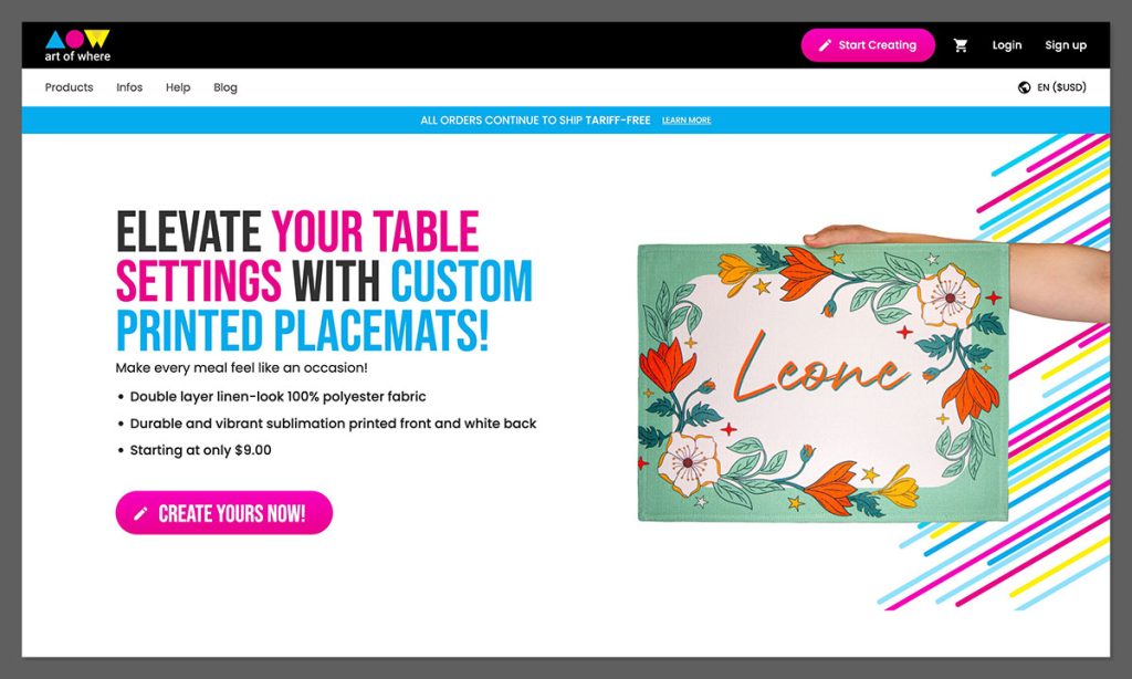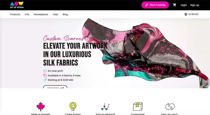 Art of Where is a print-on-demand (POD) platform offering artists a space to design, produce, and sell custom products. You can host your designs on their built-in marketplace or integrate your shop through third-party platforms.