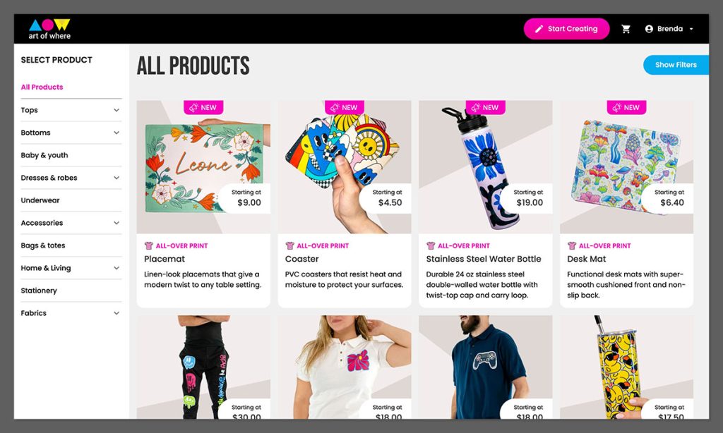 You can choose from apparel, bags, scarves, leggings, dresses, art prints, accessories, and more. With custom labels and artist cards, you can easily build your brand. Just upload your artwork — Art of Where handles the rest.