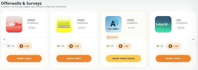 In the “Offerwalls & Surveys” section, you’ll find third-party offerwalls such as: