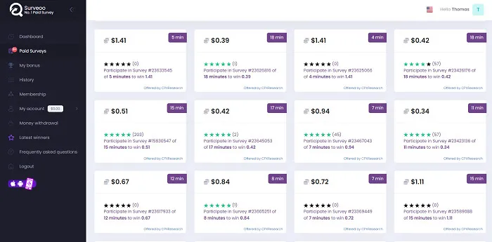 When I opened my account, Surveoo displayed dozens of surveys with payouts ranging from a few cents up to $6 or more.