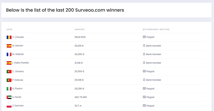 I also found plenty of payment proofs online, and Surveoo’s own “Latest Winners” section shows users cashing out regularly.