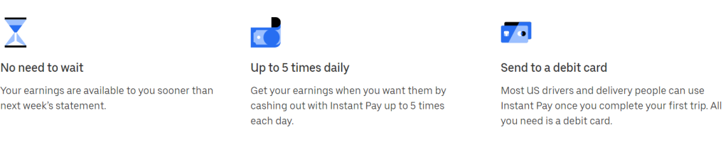 Payments are deposited automatically each week, and Instant Pay lets you cash out the same day for a small fee.