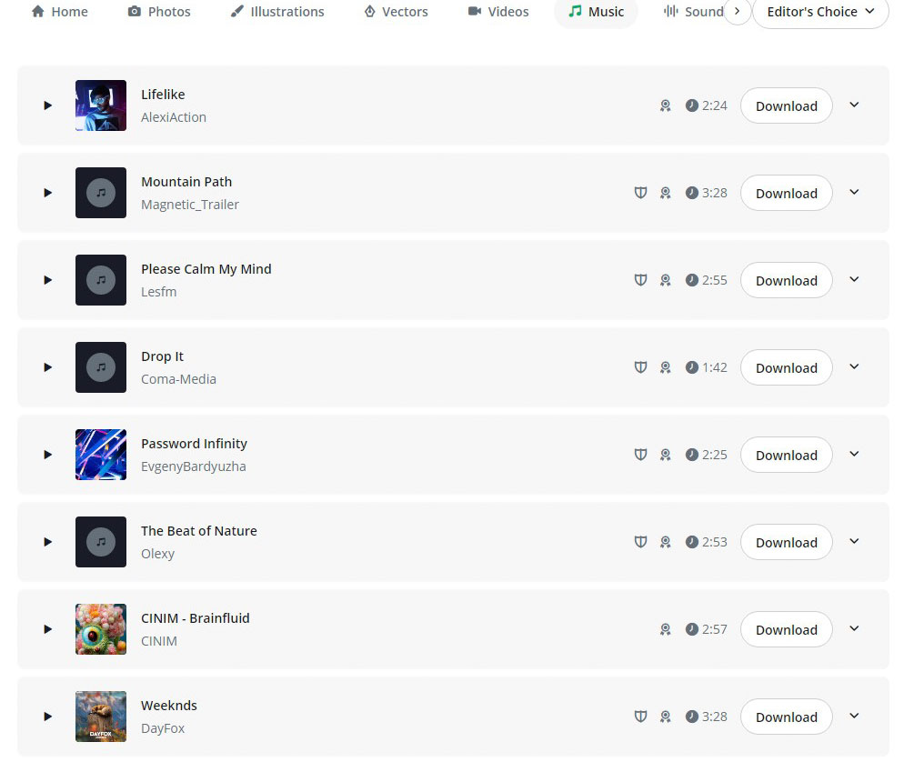 Click the play button to preview each track. If the song sounds appealing and you believe others would enjoy it, download it. If not, skip it and move on to the next one.