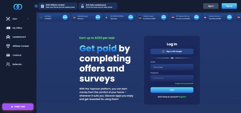 TapNoon is a newly launched Get-Paid-To (GPT) website that lets users earn real money by completing simple online tasks such as surveys, offers, games, and more. It is accessible worldwide and does pay out its members. But the real question is: is it worth your time? Let’s break down everything TapNoon offers so you can decide for yourself.