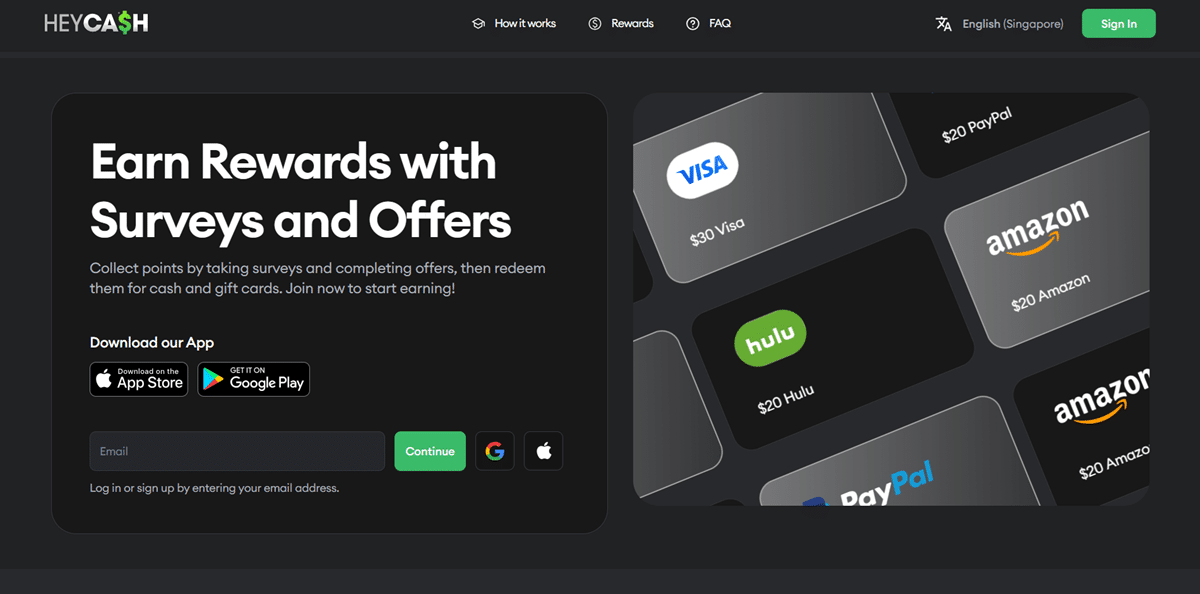 Everything you do on HeyCash — surveys, offers, games, referrals — earns points. These can be redeemed for a variety of rewards, depending on your country.