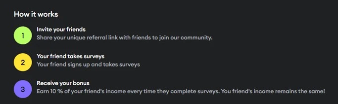Share your referral link, and when someone signs up through it and begins earning, you’ll receive 10% of their survey earnings. This does not reduce their rewards — it’s an added bonus given directly to you.